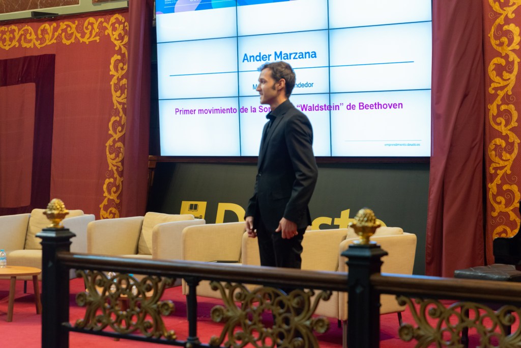 Después de una brevísima mesa redonda entre diferentes participantes de los cursos de formación de Deusto, llegó mi turno para cerrar el acto con el primer movimiento de la Waldstein de Beethoven, que encajaba perfectamente en la temática de innovación por lo revolucionaria que fue en la época. Gustó mucho al público en general, pero sacó las lágrimas de aquellos que me conocían de haber participado en el Programa de Emprendimiento Juvenil pero aún no me habían escuchado tocar en directo.