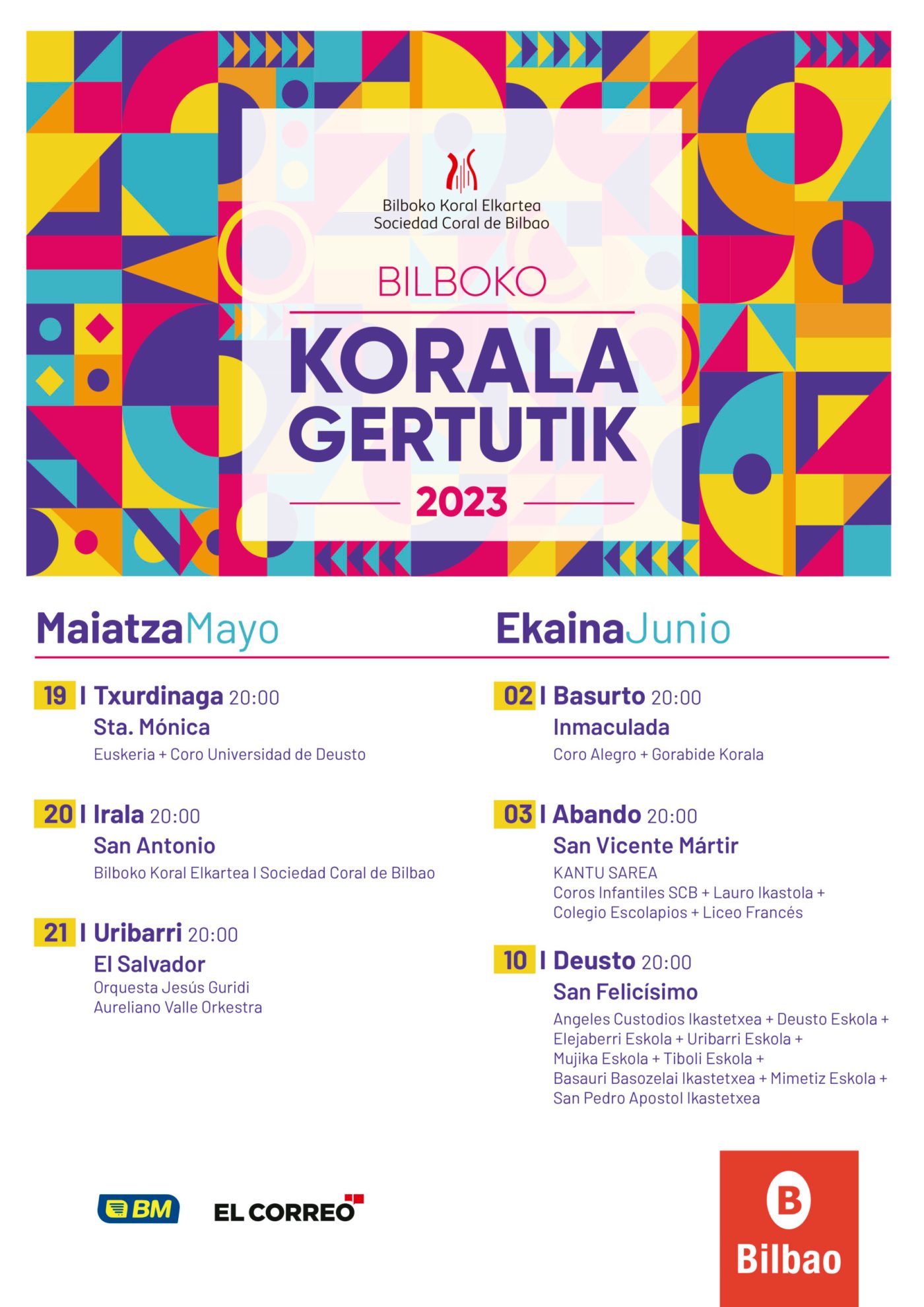 A lo largo del pasado mes de mayo, los coros de la Coral de Bilbao cantaron en su ciclo anual de conciertos Bilboko Korala Gertutik, un proyecto que tiene como objetivo acercar la música coral al público general en espacios populares y mostrar la labor académica y cultural de la Sociedad Coral de Bilbao.
