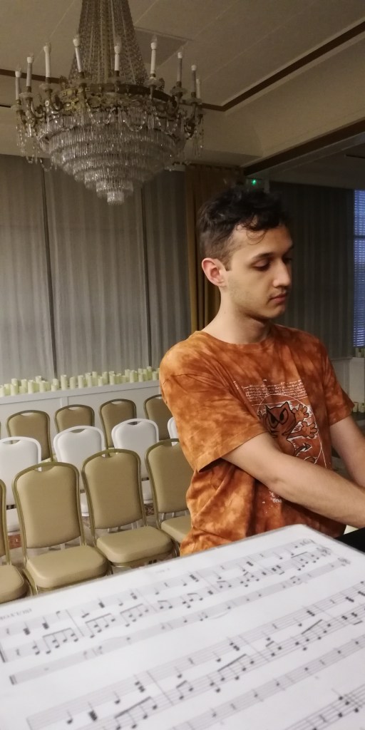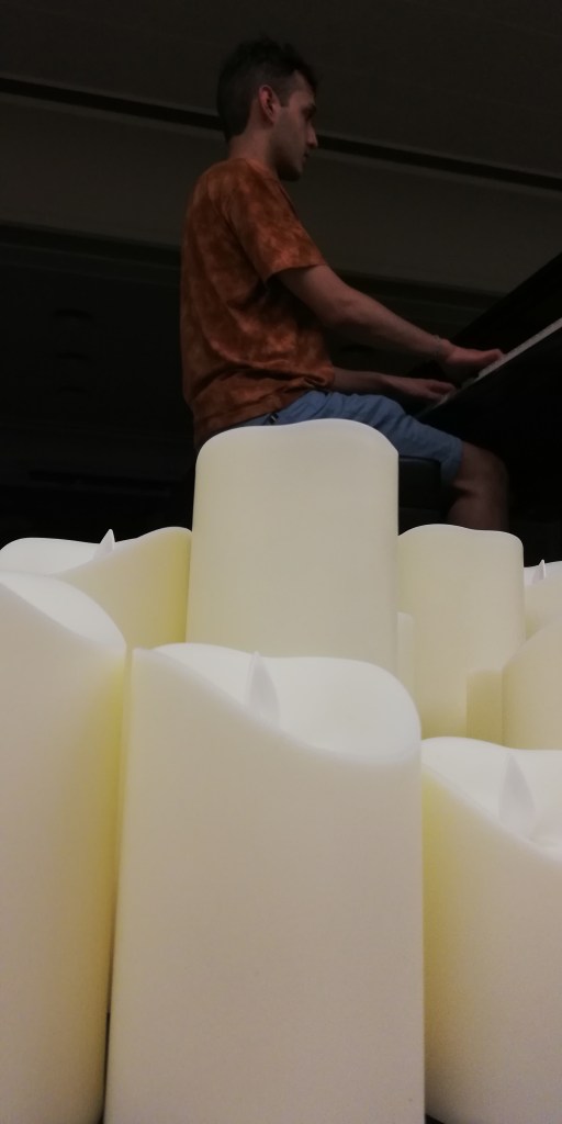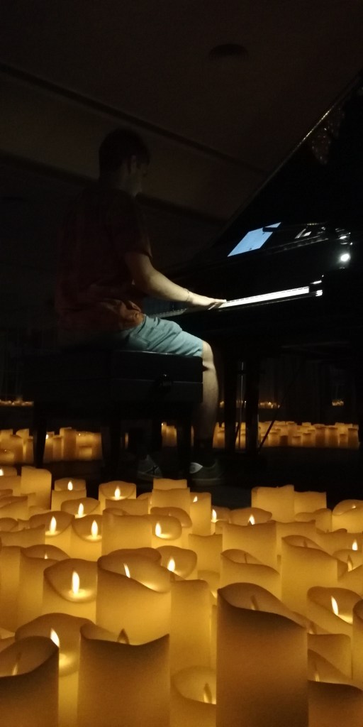 The first session, although some twenty people were absent, was sold out. The audience was seated around the piano, even behind and to the left, which was new to me. As it was a candlelit concert, the piano was dark and I had to put lights hooked to the keyboard to see where I put my hands. What I hadn’t realised was that, as I had placed them, they got in the way of me raising my hand to turn the pages and more than once I tripped over them.
