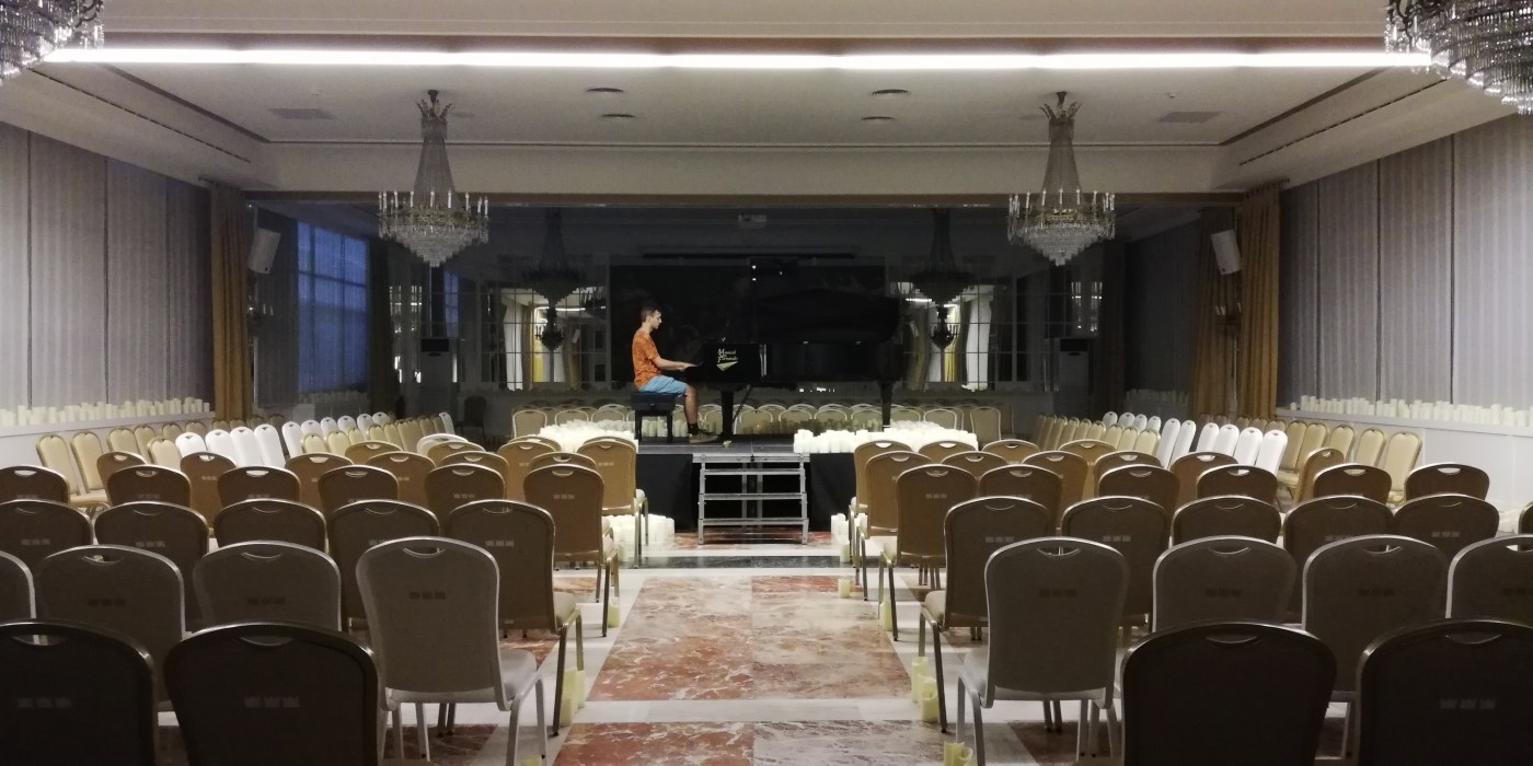 After my first experience with the repertoire in a church, I was afraid that the acoustics would again hinder my work, but this was not the case. Although the hall was stone and rectangular, the cushioned audience chairs and the curtains covering all the windows absorbed the sound very well, even though the piano was a shiny Yamaha C7.